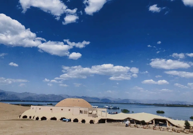 【沙湖】(含游船,56公里,车程1小时,参观约2.5小时)沙湖景区位于宁夏平罗县境内,是国家首批 5A 级景区,全国 35 个王牌景点之一。这里拥有万亩水域、五千亩沙丘、两千亩芦苇、千亩荷池,盛产鱼类、鸟类,这里栖居着白鹤、黑鹤、天鹅等数百种珍鸟奇禽。这里以自然景观为主体,是一处融江南水乡与大漠风光为一体的生态旅游景区。“金沙、碧水、翠苇、飞鸟、游鱼、远山、彩荷”几大景源有机结合,构成独具特色的秀丽景观。