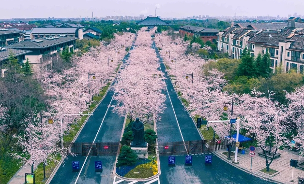 ▶  游览:粉红色的海洋,浪漫樱花大道--【鉴真路樱花大道】(游览约1小时),位于扬州鉴真图书馆西侧,长约两公