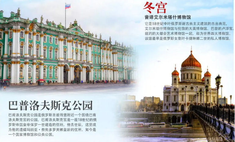 【冬宫博物馆】:与伦敦的大英博物馆、巴黎的卢浮宫、纽约的大都会艺术博物馆一起,称为世界四大博物馆。博物馆内展品非常丰富,数量多达二百五十万件,各大名画,雕像,名贵古物及沙皇曾用过的名贵马车等。