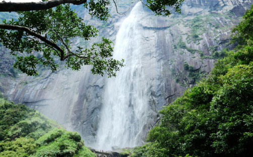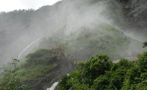 15:30穿过悬崖栈道乘坐岱仙瀑布索道到达岱仙瀑布下方。岱仙瀑布落差280.12米,“断山疑画障,悬溜泻鸣琴”,不羁的溪水如烈马脱缰,雄浑奔放,气势非凡,被誉为“华东第一瀑”。